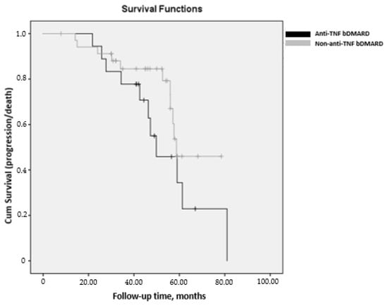 Table 5 shows the results of the Cox multivariate analysis (DV: progression or death), with a total of 116 patients with RA-ILD over a mean (SD) follow-up period of 49.1 (14.4) months. The event “progression” or “death” was recorded in 41/116 patients. The parameters assessed at baseline are included in the multivariate models. The multivariate analysis identified treatment with a non-anti-TNF bDMARD (i.e., abatacept, rituximab, or tocilizumab) as being associated with a 50% reduced risk of progression of ILD in patients with RA, whereas smoking, UIP radiological pattern, ACPA at high titers (>340), and FVC <80% at the initiation of follow-up were associated with a higher probability of progression of lung disease (Table 5). Survival was greater in patients with non–anti-TNF bDMARD than in those with anti-TNF bDMARD (mean (95%CI), 62.7 months (57.3–68.1) vs. 54.5 months (43.8–65.2); p = 0.190, log-rank) (Figure 4). The comparison of patients with RA-ILD according to bDMARD (anti-TNF or non-anti-TNF) is shown in Supplementary Table S3.