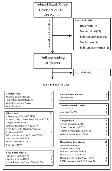 Additional filters were applied to restrict results to original research papers published during the previous 10 years, related to humans and with full text available. Individual papers were assessed by the first author, based on title and abstract for relevance, originality and quality and sorted based on virus species or virus family. The findings of the papers that are relevant for the subject matter of this review were presented in a narrative format within the following subgroups: “General Topics”, “Arboviruses”, “Blood Borne Viruses”, “Rodent Borne Viruses”, “Gastrointestinal Viruses”, “Herpesviruses” and “Respiratory tract Viruses”. Additional references were added to provide more context when necessary.
