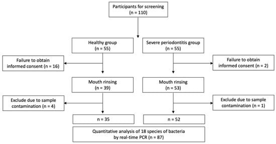 However, 18 patients refused to participate in the mouth-rinsing test. Hence, 92 patients were finally included in this study. Additionally, five subjects were excluded from the study because their mouth-rinsing solutions were contaminated in the process of transferring the collected samples (Figure 1). The study protocol was approved by the institutional review board of Veterans Health Service Medical Center (BOHUN No. 2018-03-002). All participants provided written informed consent. This study was conducted according to the Helsinki Declaration of 1975 and its later revisions.