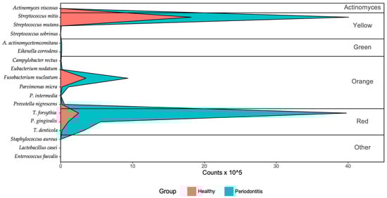 - Socransky, S.S.; Haffajee, A.D.; Cugini, M.A.; Smith, C.; Kent, R.L., Jr. Microbial complexes in subgingival plaque. J. Clin. Periodontol. 1998, 25, 134–144. [Google Scholar] [CrossRef]