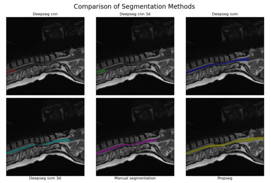 Automated segmentation for the full set of spinal cord images was then completed using SCT [13]. SCT was selected over its alternatives for two reasons. First, it is the only all-in-one package we are aware of that is specialized for application on the spinal cord, rather than being generalized to MR imaging in general [9,10]. Second, it is well documented and open source, making it easy to use and apply in clinical practices without major legal difficulties or financial burden. SCT provides two primary ways to initially segment the spinal cord; ‘PropSeg’ [27] and ‘DeepSeg’ [28]. PropSeg functions by initially detecting an initial slice of the spinal cord, then propagating that slice across the remainder of the spinal cord, adjusting as it goes. DeepSeg, in contrast, tries to identify the entire segmentation simultaneously, using either a Convolutional Neural Network (CNN) or Support Vector Machine (SVM) to do so. The model can also take into account only data in a given 2D slice, or the entire 3D image; we chose to test all combinations available. This resulted in 5 different automated segmentation methods being assessed in total. A segmentation method comparison, performed on a sagittal MRI image slice from a patient with severe DCM, is shown in Figure 2.