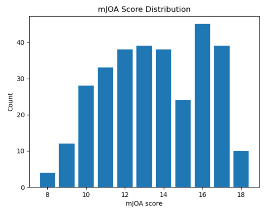 A box plot showing the number of individuals in our study with any given mJOA score. Although not quite ideal, this distribution is relatively balanced across the mid-range of mJOA scores. Note as well that extreme values (mJOA = 18 and mJOA = 8, 9) are rather rare, as would be expected given the acquisition method we used (data taken from those diagnosed with DCM who were undergoing initial assessment).