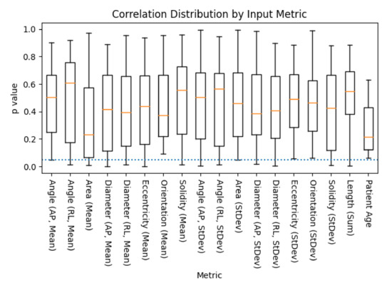 A box plot of the distribution p-values of metric to mJOA score correlations, across all combinations of acquisition contrast, orientation, and segmentation algorithm, as evaluated via SciKit-Learn’s ‘f_regression’ algorithm (lower is better). Age was included as a control, as it has been previously shown to be correlated with mJOA score [32]. The dotted blue line represents the threshold of significance for this study (), with whiskers representing the maximum/minimum value of the set, or 1.5 times the inter-quartile range, whichever is shorter.