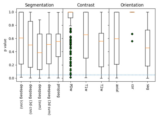 A box plot of the distribution p-values of metric to mJOA score correlations, grouped by acquisition contrast, orientation, and segmentation algorithm, as evaluated via SciKit-Learn’s ‘f_regression’ algorithm (lower is better). The dotted blue line represents the threshold of significance for this study (), with whiskers representing the maximum/minimum value of the set, or 1.5 times the inter-quartile range, whichever is shorter. Data points outside this range are denoted with green diamonds. Of the methods, it appears that segmentation using deepseg with a svm kernel provided the best results, as did those processed with a T2w contrast along the sagittal plane. However, all but coronal alignment appears capable of statistically significant metric extraction in at least some manner, though the PDw contrast is quite likely a fluke as well (due to its low sample size).