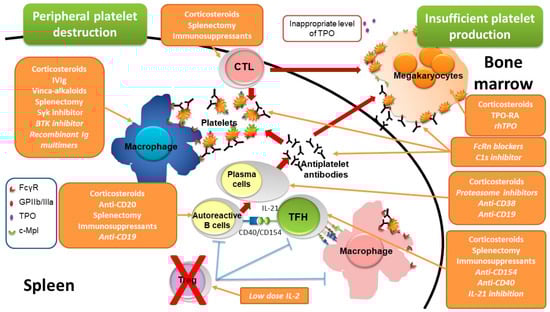ITP is due to an autoimmune peripheral destruction of platelets by their recognition by autoantibodies (Figure 1), targeting different glycoproteins (GPs), mostly GPIIb/IIIa and GPIb/IX, that mediate antibody-dependent cellular phagocytosis (ADCP), antibody-dependent cellular cytotoxicity (ADCC) and complement dependent cytotoxicity (CDC) [6,7]. Opsonized platelets are phagocytosed by splenic macrophages in an Fcγ receptor (FcγR)-dependent mechanism [8]; splenic macrophages also play the role of major antigen-presenting cells in ITP [9]. The desialylation of platelets is another mechanism that could be involved in platelet destruction, desialylated platelets being recognized by the Ashwell–Morell receptor expressed by hepatocytes and being destroyed in the liver in a FcγR-independent mechanism [10]. Antiplatelet antibodies are produced by autoreactive B cells stimulated by T follicular helper cells that provide activation signals through CD40 ligation and interleukin (IL)-21 [11]. Overall, this autoimmune response is favored by a deficiency of regulatory T cells (Treg) [12,13]. There is also insufficient bone marrow production of platelets resulting from both an immune response directed against megakaryocytes [14] but also from inappropriate concentration of thrombopoietin (TPO) [15], the major growth factor of megakaryocytes.