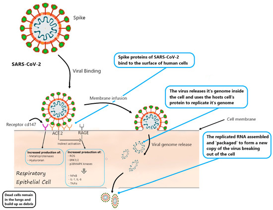 An essential receptor for viral cell entry is ACE2 (Angiotensin-Converting Enzyme 2). Physiologically ACE2 plays an important role in the Renin–angiotensin–aldosterone system (RAAS) and the imbalance between the ACE/Ang II/AT1R pathway and the ACE2/Ang/Mas receptor pathway in the RAAS system results in blood pressure disturbances and multi-system inflammation [54].