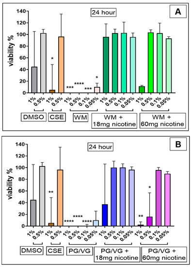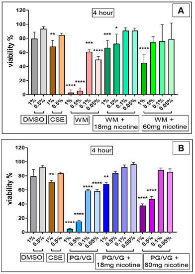 CSE (1%) treatment significantly reduced viability at both 4 h (Figure 2; p < 0.01) and 24 h (Figure 3; p < 0.05) in comparison with cell controls and independent of the original DMSO solvent. 24 h post-treatment with nicotine-free WM e-liquid and PG/VG condensates (Figure 3) resulted in total cell death at 1%, 0.5%, and 0.1% (p < 0.0001, p < 0.001) concentrations tested, with significant decrease also observed in low concentrations of 0.05% for WM (p < 0.05) (Figure 3A). Such reduction in viability was also observed for higher concentrations (1%, 0.5%) of condensates without nicotine following 4 h treatment (p < 0.0001), which faded in lower concentration (0.1%, 0.05%) (p < 0.0001, p < 0.001) (Figure 2). Interestingly in comparison to non-nicotine bases, condensates with nicotine content of 18 mg/mL and 60 mg/mL in WM-flavored e-liquid and PG/VG showed greater viability at 0.1% and 0.05% concentration at 4 h (Figure 2) and 24 h (Figure 3) post-treatment. 4 h exposures to 1% and 0.5% concentrations of these condensates (WM or PG/VG with nicotine) did however result in significant reduction in viability (p < 0.0001; p < 0.001; p < 0.05) (Figure 2). This significantly reduced viability was also noticed 24 h post-exposure to similar higher concentrations (1%, 0.5%) of condensates from PG/VG with 60 mg/mL nicotine (Figure 3B; p < 0.01; p < 0.05) and high concentration (1%) condensate from WM with 60 mg/mL nicotine (Figure 3A; ns). The percentage of cytotoxicity, as determined by CCK-8 assay, increases over time (from 4 h to 24 h; Figure 6). Comparatively, the degree of change in %viability between 4 and 24 h treatments is higher in nicotine containing condensates and CSE, with greatest change seen in WM and PG/VG with 60 mg/mL nicotine, and CSE (Figure 6).