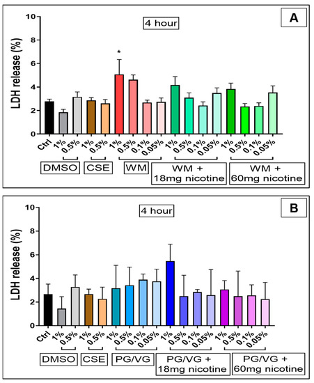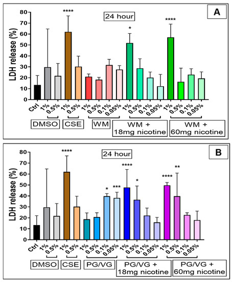 LDH release 4 h post-treatment (Figure 4) was lower than 24 h, with cellular disruption likely yet to occur; however, we observe a slight relative increase in LDH release for 1% WM (p < 0.05; Figure 4A). Treatment with CSE (1%) (p < 0.0001) and high concentrations (1%) of e-cigarette condensates containing nicotine (18 mg/mL and 60 mg/mL) (p < 0.0001; p < 0.05) for 24 h resulted in large increases in LDH release (Figure 5), thus indicating cell membrane disruption and damage in these cells (Figure 5A,B). Percentage LDH release from 24 h condensate treatment (1% with nicotine) was comparable to CSE treatments at a similar dose. Exposure to high concentrations (0.5%) of condensates from PG/VG with 18 mg/mL and 60 mg/mL nicotine (p < 0.05; p < 0.01) also significantly increased LDH release post 24 h exposure (Figure 5B). Increasing levels of LDH release are noticeably pronounced after 24 h, and a nicotine-dependent accentuation in cellular membrane disruption in BEAS-2B cells was observed (Figure 6).