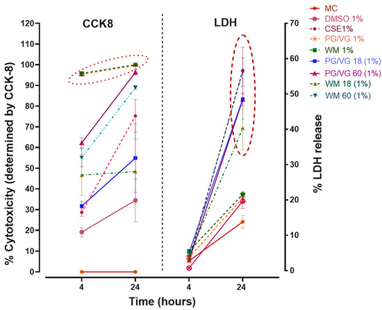 Time- and nicotine-dependent changes in LDH release and cytotoxicity of BEAS-2B cells following electronic cigarette aerosol and cigarette smoke exposure: Graphical representation comparing percent cytotoxicity (left) and percent lactate dehydrogenase (LDH) release (right) in BEAS-2B cells for 4 and 24 h post-treatment with condensates (1%) with and without nicotine, and cigarette smoke extract (CSE1%) and DMSO1%, with non-treated cells as controls (MC). Overall percentage increase in cytotoxicity was noticed in all treatments over controls. A nicotine-associated differential effect was accentuated in CCK-8 results for most nicotine-containing condensates (PG/VG 18 mg, PG/VG 60 mg, WM 60 mg, CSE) but is absent for PG/VG 1% and WM 1% (marked in a dotted circle). Watermelon-flavored e-liquid and PG/VG nicotine-containing condensates (marked in the red dashed circle) showed a higher percent LDH release similar to CSE treatment, while watermelon (WM) and PG/VG on their own showed lower LDH release. n = 3–4 independent experiments.