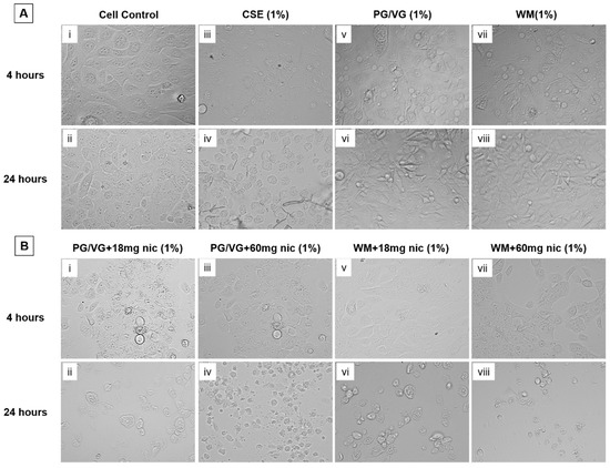 Morphological changes to BEAS-2B cells following electronic cigarette aerosol condensate and cigarette smoke exposure. (A) Cell controls, CSE and condensates without nicotine for 4 and 24 h treatments; (B) condensates with nicotine for 4 and 24 h treeatments. Brightfield microscopy images were taken at 40× objective of BEAS-2B cells following exposure to electronic cigarette condensates (PG/VG or WM) ± nicotine or CSE for 4 or 24 h and assessed for morphological changes in comparison with cell controls.