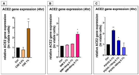 Angiotensin-converting enzyme-2 (ACE2) mRNA expression in BEAS-2B cells following cigarette smoke exposure and electronic cigarette condensates: BEAS-2B cells were exposed to (A) cigarette smoke extract (0.5% and 1%) or 0.1% concentration of electronic cigarette condensate generated from (B) watermelon-flavored e-liquid (Juicius Maximus) or (C) PG/VG ± nicotine for 4 h. Gene expression for ACE2 was assessed in treated cells and is presented as relative gene expression over cell controls, normalized with cytotoxicity for each treatment. Data are displayed as a median and interquartile range of n = 3–4 independent experiments. Nonparametric Mann–Whitney test was performed. ** p < 0.005, * p < 0.02.