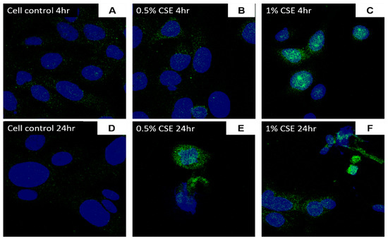 Following 4 h of CSE (1%) treatment, a 3-fold ACE2 mRNA expression was observed in comparison to cell control (Figure 8A; p < 0.005). Immunofluorescence staining also revealed an overall increase in ACE2 protein expression with CSE treatment in comparison with untreated controls for 4 or 24 h treatment (Figure 9A–F). SAECs treated with 1% CSE also had a significant increase in ACE2 following 4 h exposure (Figure 12B). 4 h exposure to 0.5% and 1% CSE resulted in the observed localization of ACE2 expression towards the nuclei (Figure 9B,C), which is of similar localization and staining pattern as experiments with electronic cigarette condensates.