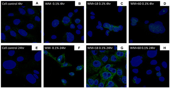 ACE2 protein expression of BEAS-2B cells following electronic cigarette aerosol (WM) exposure: BEAS-2B cells were exposed to a concentration (0.1%) of electronic cigarette condensate generated from watermelon e-liquid (WM) ± nicotine for 4 or 24 h. Protein expression of ACE2 was assessed through immunofluorescence staining for 4 h (B–D) and 24 h (F–H) treatments in comparison with cell controls (A,E). Images at 40×.