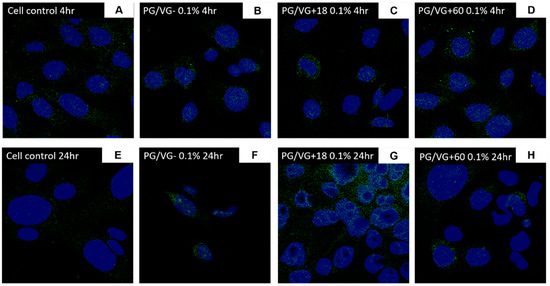 ACE2 protein expression of BEAS-2B cells following electronic cigarette aerosol (PG/VG) exposure: BEAS-2B cells were exposed to a concentration (0.1%) of electronic cigarette condensate generated from PG/VG ± nicotine for 4 or 24 h. Protein expression of ACE2 was assessed through immunofluorescence staining for 4 h (B–D) and 24 h (F–H) treatments in comparison with cell controls (A,E). Images at 40×.