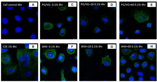 ACE2 protein expression of SAECs following CSE and electronic cigarette aerosol (PG/VG or WM) exposure: Small airway epithelial cells (SAECs) were exposed to a concentration (0.1%) of electronic cigarette condensate generated from PG/VG or WM ± nicotine or to 1% CSE for 4 h. Protein expression of ACE2 was assessed through immunofluorescence staining for 4 h (B–H) treatment in comparison with cell control (A). Images at 40×.