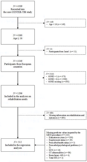 To assess rehabilitation needs, 1206 individuals over 16 years of age were selected from the 17 European countries involved in the CENTER-TBI project. Participants from Israel (n = 11) were excluded as this study assesses the rehabilitation needs across the Europe. All selected individuals showed TBI-related moderate-to-severe disability outcome—as measured by the GOSE score—at their six-month follow-up appointment. The GOSE score consists of an eight-point scale (1: dead, 2: vegetative state, 3/4: lower/upper severe disability, 5/6: lower/upper moderate disability and 7/8: lower/upper good recovery) and is based on structured clinical interviews or self- or proxy- ratings. Besides the GOSE, the patient- or proxy-reported version of the GOSE questionnaire (GOSE-Q) [] administered by postal mail was used to collect information on disability outcomes. The GOSE-Q score was centrally computed, combined with the GOSE interview score and integrated into the CENTER-TBI database. As the questionnaire version does not distinguish between vegetative state and lower severe disability categories, the two were collapsed into one group. The present study includes individuals exhibiting lower-severe to upper- moderate disability outcomes six-months post-injury. For the regression analyses, only those individuals who provided information on received rehabilitation services and impaired outcomes were selected resulting in an effective sample size of 512 individuals. For more details on samples attrition, see Figure 1.