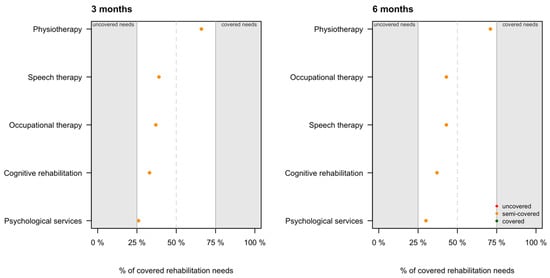 Overall, at both time points rehabilitation needs were semi-covered across all outcome domains (i.e., between 25% and 75% of those impaired received the necessary support)—the only ranking difference between the time points involved occupational and speech therapies. While occupational therapy was a more frequent part of the rehabilitation program component at three months post-TBI, speech therapy was more highly ranked at six months. At each time point, psychological services were the least frequent service provided relative to documented impairment. For details, see Figure 2.