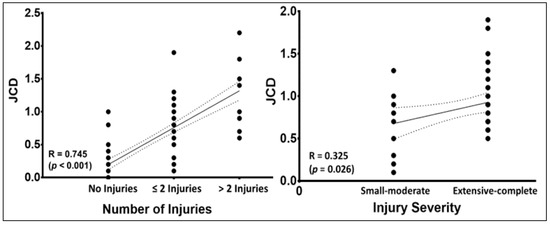 Figure 2 shows a strong positive correlation between JCD and number of injuries (R = 0.745; p < 0.001). Furthermore, there was a moderate positive correlation between JCD and injury severity (R = 0.325; p = 0.026).