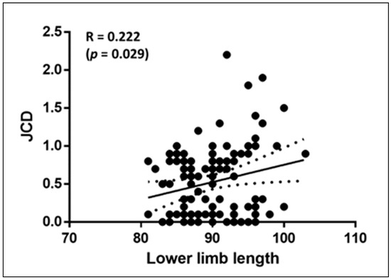 Figure 3 displays a significant positive Pearson’s correlation between JCD and lower limb length (R = 0.222; p = 0.029).