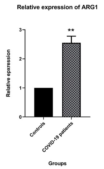 The expression of Arg1 in coronavirus disease 2019 (COVID-19) patients compared to the control group. The relative expression of Arg1 in COVID-19 patients was 2.3 times more than in healthy groups. (** p < 0.01).