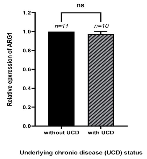 The relative expression of Arg1 in COVID-19 patients with or without the underlying chronic disease (UCD). There were no significant differences in the expression of Arg1 between the COVID-19 patients with the UCDs and the COVID-19 patients without UCDs. The numbers of COVID-19 patients with UCDs and without UCDs were 10 and 11, respectively.
