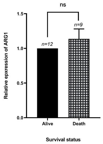 Our results showed no significant differences between the Arg1 expression and the survival status of patients with COVID-19 (p > 0.05) (Figure 3).