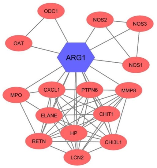 The search tool for the retrieval of interacting genes/proteins (STRING) apps of Cytoscape v3.8.1 was utilized to find the most connected genes with Arg1 [,]. The cut-off criteria were confidences score ≥ 0.700, maximum interactors = 30, and blood tissue specificity = 2.5.