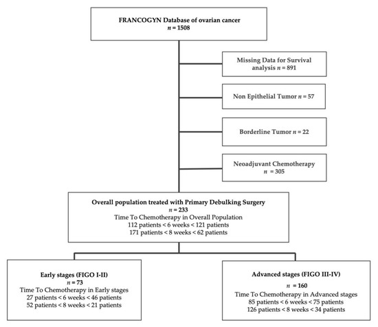 The study population was women with EOC classified into two subgroups according to their stage as defined in the 2014 International Federation of Gynecology and Obstetrics (FIGO) classification [19]: Early-Stage Group (ESG) (FIGO I-II) and Advanced-Stage Group (ASG) (FIGO III-IV) [19,20]. TTC was defined as the time between primary CRS and the initiation of chemotherapy. We hypothesized that a delay in initiating chemotherapy after CRS could impact survival and chose to study two TTC thresholds: 6 weeks as defined in the French recommendations [2], and 8 weeks as it is commonly stated that a TTC over 6 weeks is associated with poorer outcomes. All women with EOC who had undergone primary complete macroscopic CRS were included. All patients received adjuvant therapy (6 cycles of adjuvant platinum-based chemotherapy: carboplatin AUC5, paclitaxel 175/m2, ±targeted therapy according to international guidelines at the time of management). Tumor histology was classified as serous, mucinous, endometrioid, or clear cell. Data about peri- and postoperative complications were not available. Patients treated by neoadjuvant chemotherapy or chemotherapy alone were excluded. Patients with ovarian borderline tumors and patients who underwent CRS with macroscopic residual tumor after surgery were excluded. The following clinical and pathologic variables were collected: age, comorbidities, parity, surgical procedure, stage according to the 2014 FIGO classification [19], final pathologic analysis, adjuvant therapies, date of recurrence, death, or latest news.