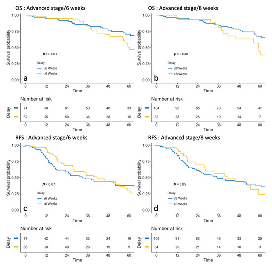 Survival analysis of Overall Survival (OS) (before and after 6 weeks: (a), before and after 6 weeks: (b) and Recurrence-free Survival (RFS) (before and after 6 weeks: (c), before and after 6 weeks: (d) in Advanced stages.