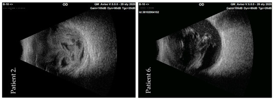 The first signs of endophthalmitis appeared approximately 24 h after the intraocular injection. The patients underwent the vitrectomy approximately 48 h after the first intraocular intervention (range: 36–72 h). The patient group comprised four males and three females, and their average age was 71 years old (range: 56–85 years old) (Table 1). There was a suspicion that the nurses in the operation theatre did not wear face masks during preparation for the surgery. The ultrasound examination was performed in all patients to visualize the inflammatory process in the vitreous cavity. Figure 1 shows the initial ultrasound images of two patients (patient 2 and patient 6).