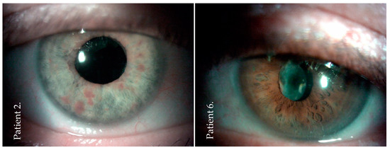 Slit-lamp image of the anterior segment at the final examination (after six months) of two patients (patients: numbers 2 and 6) after post-injection endophthalmitis. No conjunctival irritation but a clear cornea and a clear anterior chamber were observed. There was posterior capsule opacification in patient number 6.