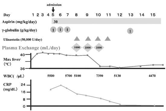 - Takagi, N.; Kihara, M.; Yamaguchi, S.; Tamura, K.; Yabana, M.; Tokita, Y.; Ishii, M. Plasma exchange in Kawasaki disease. Lancet 1995, 346, 1307. [Google Scholar]