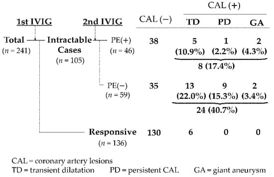 In our 2004 report, we investigated the safety and preventive effect of PE on CALs in IVIG-refractory patients (Figure 2) [8,9]. The 105 patients who were refractory to second IVIG treatment were divided into two groups: those who received PE therapy (PE(+) group: 46 patients) and those who received additional IVIG (PE(−) group: 59 patients), and their incidence of CALs in the acute phase was compared and examined. The patients were divided into three groups: transient dilatation (TD), in which coronary artery dilation was found but normalized within 30 days of onset; persistent dilatation (PD), in which dilation remained beyond 30 days; and giant aneurysms (GA), in which the aneurysm was larger than 8 mm in diameter. In the PE(−) group, CALs were found in 24 (40.7%) of 59 patients (13 TD, 9 PD, and 2 GA), whereas in the PE(+) group, CALs were found in only 8 (17.4%) of 46 patients (5 TD, 1 PD, and 2 GA), showing a sufficiently significant difference (p = 0.022). Multivariate analysis revealed that PE therapy significantly reduced the incidence of CALs compared with additional IVIG therapy, with an odds ratio of 0.052 (p = 0.0012) (Table 5).