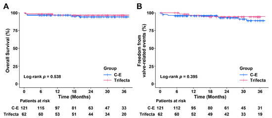 Survival and freedom from valve-related events in the unmatched cohort: (A) The Kaplan–Meier estimate of survival for the Carpentier-Edwards (C-E, blue line) and Trifecta (red line) valves; (B) The same Kaplan–Meier estimate of freedom from valve-related events.