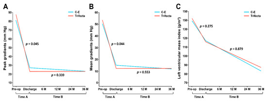 Changes in echocardiographic measurements over time for the Carpentier-Edwards (C-E) and Trifecta valves: (A) Peak gradient from baseline to discharge (Time A) and from immediately after surgery to 3 years postoperatively (Time B); (B) Mean gradients following the same timeline; (C) Left ventricle mass index (LVMI). No significant time-valve effects on gradients or LVMI were found. p-values shown for analyses from baseline to discharge (Time A) and the interaction of the mixed model.