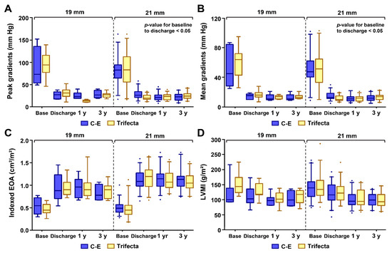 The Trifecta group had significantly larger theoretical IEOAs (calculated by dividing the manufacturer’s EOA by the BSA) at discharge than that of the C-E group (1.01 ± 0.10 vs. 0.96 ± 0.08 cm2/m2, p = 0.001), but the in vivo IEOAs (EOA measured by echocardiogram) were similar in both groups (p = 0.995). In addition, LVMI in the C-E and Trifecta groups decreased from 137.5 ± 40.1 g/m2 and 145.3 ± 39.0 g/m2 at baseline to 98.9 ± 20.7 g/m2 and 101.6 ± 24.1 g/m2, at 3 years postoperatively, respectively (reduction rate: 28.1% and 30.1%). As shown in Figure 2C, although LVMI decreased steadily over time after surgery, no differences were noted between the two groups (p = 0.879).