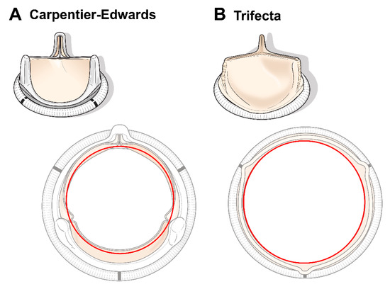 Two different valve designs: (A) Carpentier-Edwards (C-E) valve with internally mounted leaflets; (B) Trifecta valve with externally mounted leaflets. The Trifecta valves are associated with a larger effective orifice area than the C-E valves.