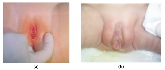 (a). Vulvovaginitis in a two-month-old girl. (b). Vulvovaginitis in a premature newborn (29 weeks of gestational age).