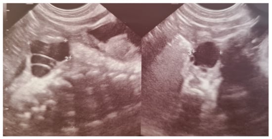Ovarian cysts usually arise from mature follicles and are the most common abdominal cysts in female fetuses and newborn girls [34,35]. They result from fetal exposure to maternal and fetal gonadotropins and are found more often in newborns whose mothers had increased levels of human chorionic gonadotropin – hCG (diabetes, maternal isoimmunization). Most of them are detected prenatally [34,35]. Ultrasonography is the imaging technique of choice for diagnosing ovarian cysts, as it makes it possible to differentiate them from other cystic lesions. Most ovarian cysts are functional, benign follicular cysts that do not interfere with the course of pregnancy or birth. They can be divided into simple or uncomplicated—completely anechoic, homogenous, and thin-walled—and complex or complicated—characterized by fluid-debris level and a thick echogenic wall, which may contain solid components, clot, or septa (Figure 3). In infants, complex cysts are most consistent with ovarian torsion that occurred prenatally. Frequently, even complex cysts regress after birth, as maternal hormone stimulation decreases [35,36,37].
