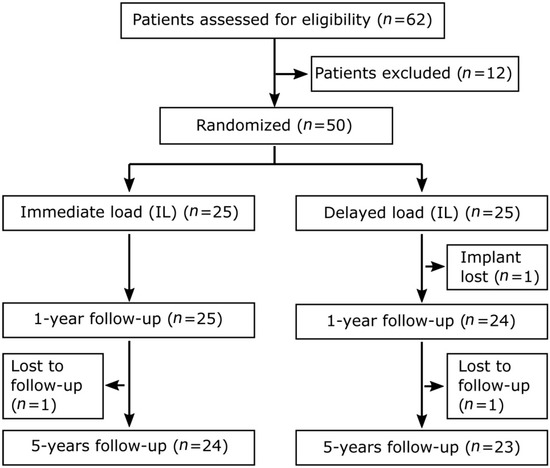 All patients attended the 12-month follow-up. At the 5-year follow-up, the total number of unaccounted patients was two (4.0%): one patient in the DL group was not possible to contact and one patient in the IL group did not want to attend the clinical consultation. The later patient confirmed that the implant and restoration were still in place and that he had not experienced any problems, which was considered as survival.