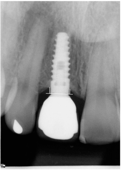 For the assessment of MBL digital intra-oral periapical radiographs (Schick Digital X-ray Sensor, Sirona, Salzburg, Austria) were taken using the long-cone parallel technique. The marginal bone level was measured (Image J, National Institute of Health, Bethesda, MD, USA) after calibration with the inter-thread distance of the Tapered Internal implants (1.00 mm). Measurements were taken from the implant-abutment junction to the marginal bone level. The mean value from the mesial and distal measurements was obtained and used for the analysis (Figure 2). MBL was calculated by comparing the follow-up examinations to the baseline examination.