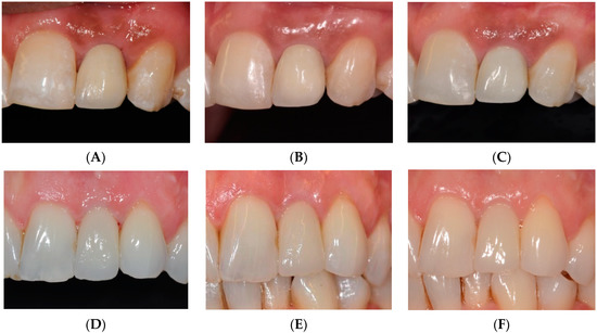 Examples of photograph follow-up for both groups. (A) Delivery of final restoration IL, (B) 1-year follow-up IL, (C) 5-year follow-up IL, (D) Delivery of final restoration DL, (E) 1-year follow-up DL, (F) 5-year follow-up DL.