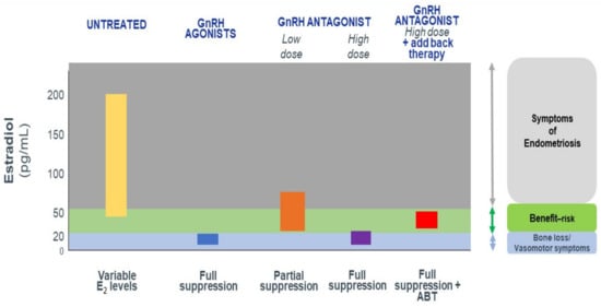 The aim of this review is to present, based on recent literature, various medical options for the management of symptomatic endometriosis, a common chronic inflammatory disease causing pain and infertility [,,]. Between 5% and 10% of women of reproductive age are affected [,]. There are three distinct forms of the disease (peritoneal, ovarian and rectovaginal endometriosis) and each of them may be associated with specific symptoms, although dysmenorrhea and chronic non-menstrual pelvic pain are the most prevalent []. Nevertheless, one common pathogenic mechanism shared by all forms of the condition is the impact of estradiol (E2), which is known to have proinflammatory and antiapoptotic effects on endometrial cells, especially in ectopic foci [,].