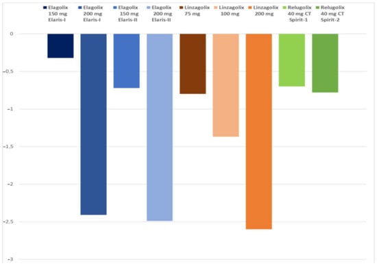 - Carr, B.; Dmowski, W.P.; O’Brien, C.; Jiang, P.; Burke, J.; Jimenez, R.; Garner, E.; Chwalisz, K. Elagolix, an oral GnRH antagonist, versus subcutaneous depot medroxyprogesterone acetate for the treatment of endometriosis: Effects on bone mineral density. Reprod. Sci. 2014, 21, 1341–1351. [Google Scholar] [CrossRef] [PubMed]