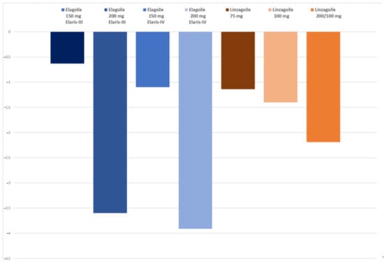 The efficacy of six-month treatment with elagolix was evaluated in two large, double-blind, phase III trials (Elaris EM-I and Elaris EM-II) []. Overall, 872 and 817 women with pain and moderate-to-severe endometriosis underwent randomization in Elaris EM-I and EM-II, respectively. Two different regimens of elagolix (150 mg once daily and 200 mg twice daily) were tested.