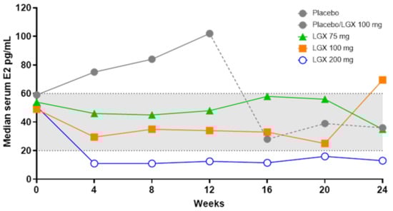 There was a dose-dependent increase in the rate of amenorrhea from weeks 4 to 24. At week 12, estimated amenorrhea rates were 4.3% in the placebo group and 36.3%, 55.8% and 80.9% in the 75 mg, 100 mg and 200 mg dose groups, respectively. Concerning serum E2, there was rapid and full suppression to 11 pg/mL in the 200 mg dose group by week 4, which was maintained (range 11–16 pg/mL) up to week 24 (Figure 5). With the 75 mg and 100 mg doses of linzagolix, there was dose-dependent partial suppression of serum E2 to between 20 and 60 pg/mL.
