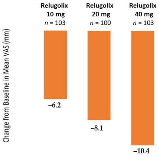 - Osuga, Y.; Seki, Y.; Tanimoto, M.; Kusumoto, T.; Kudou, K.; Terakawa, N. Relugolix, an oral gonadotropin-releasing hormone receptor antagonist, reduces endometriosis-associated pain in a dose-response manner: A randomized, double-blind, place-bo-controlled study. Fertil. Steril. 2021, 115, 397–405. [Google Scholar] [CrossRef]