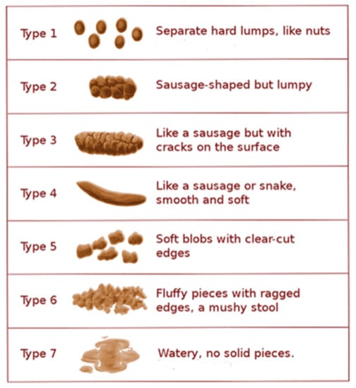 - Lewis, S.J.; Heaton, K.W. Stool form scale as a useful guide to intestinal transit time. Scand. J. Gastroenterol. 1997, 32, 920–924. [Google Scholar] [CrossRef] [PubMed]