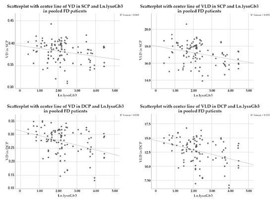 In this study, we observed an inverse association between VD and VLD with lysoGb3 DBS levels in our cohort of genetically proven FD patients. We also show an inverse association of lysoGb3 with VD and VLD of the SCP of our male subgroup, but not in the DCP. However, in the other subgroups, we were unable to detect any statistically significant association.