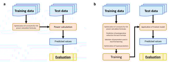 The current research utilized a retrospective study design. Figure 1a shows the flow of prediction using the conventional IOL calculation formulas. The constants for the formulas were optimized using training data. Figure 1b depicts the flow of prediction using ML methods.
